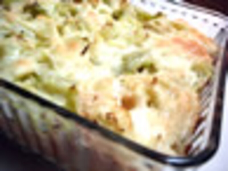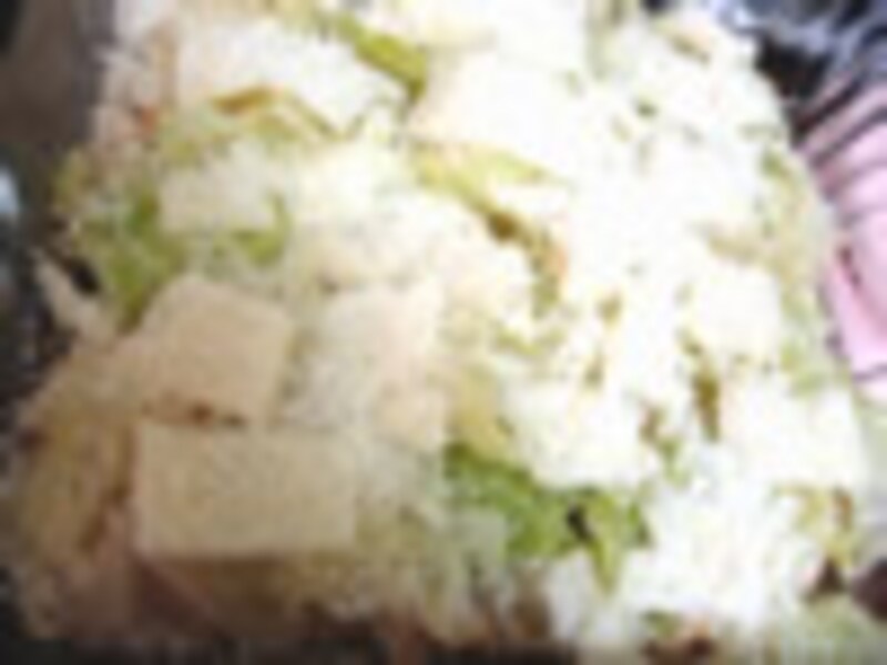 3.深底の耐熱皿にオリーブオイルを塗り、レードル2杯分の2のブロードを注ぎ、パンを敷き詰めます。その後、またブロードをレードル2杯分程パン全体にかかるよう注ぎ、キャベツをしき、スライスしたアジアーゴを適量に散らし、すりおろしのパルミジャーノを振ります。またパン→ブロード→キャベツ→アジアーゴ→パルミジャーノの順に敷き詰めます。