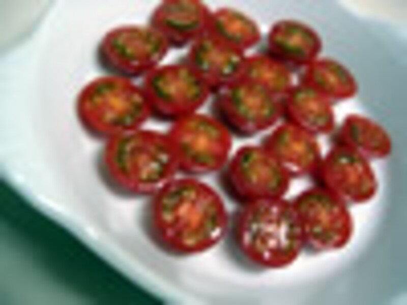 1.ミニトマトはヘタをとり、横半分に切り、耐熱皿に並べ、軽く塩をする。