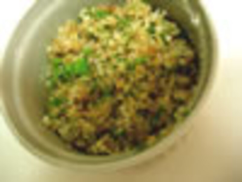 2.他の容器に、パン粉、みじん切りにしたイタリアンパセリ、すりおろしのニンニクとすりおろしのグラナパダーノを入れ合わせ、まんべんなく混ざったらオリーブオイル(分量大さじ1杯)を入れ、全体がオイルでしっとりするようにあわせる。