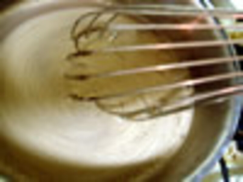 2.厚底の鍋に牛乳を入れ、人肌に温めたら、弱めの中火にし、1のペーストを3回位に分けて入れ、その度にミキサーで溶かすようにかき混ぜる。カスタードクリームを作るように、もったりするまでじっくりと混ぜ、あとをひくよう(文字が書けるかの様)になったら、器に注ぐ。