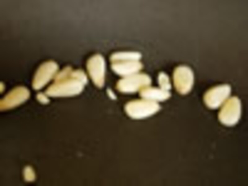 2.フライパンを弱火にかけ、松の実を軽く炒る。表面がうっすらとキツネ色になったら火からおろす。