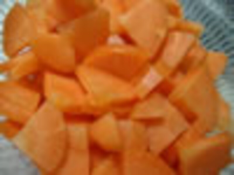 1.ニンジンは皮をむき、厚さ5mmの扇切りにする。