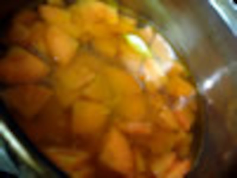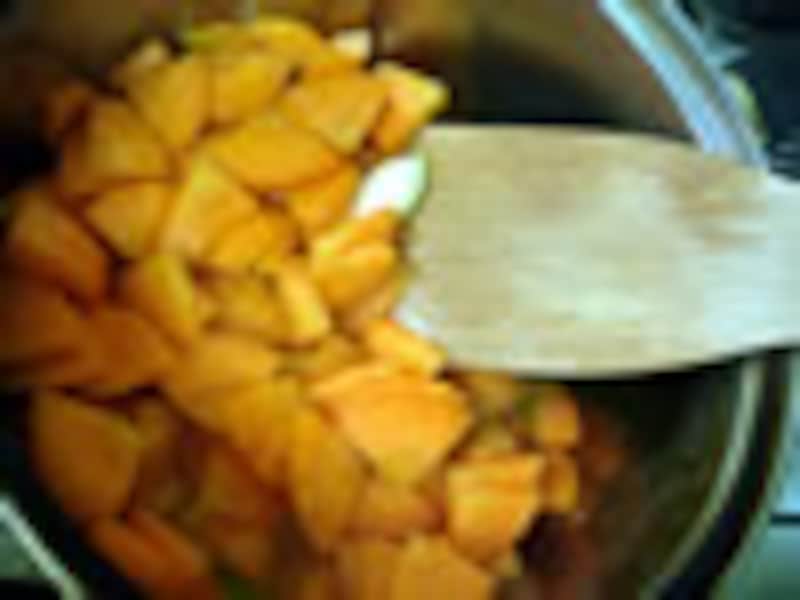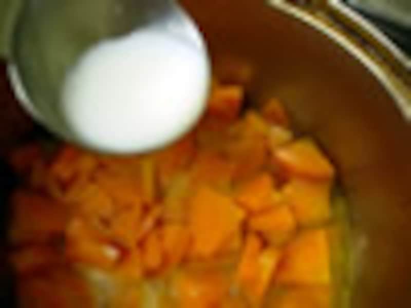 3.ニンジン全体にオイルがなじんだら、ニンジンがヒタヒタにかぶるくらい、水を注いで、弱火でフタをしないで20分程度煮込む。