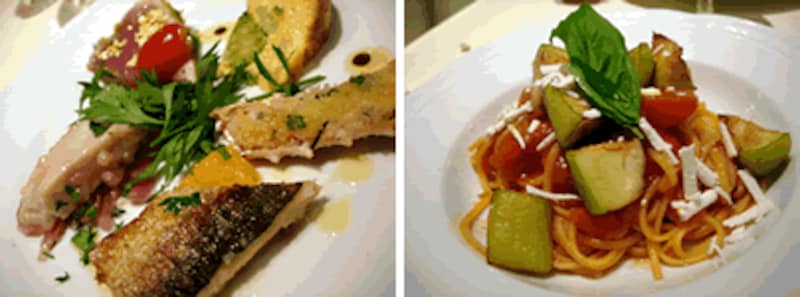 左/新鮮な魚介を使ったシチリア風前菜の盛り合わせ |