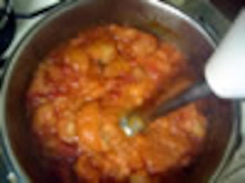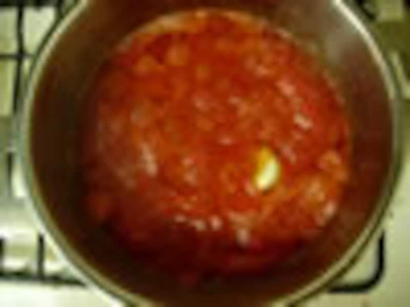 1.深めの厚底鍋にオリーブオイルとニンニクを入れ、中火にかけ、香りが出たらトマトホールを注ぎ入れ、トマトを崩しながら煮る。