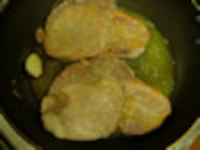2.フライパンにオリーブオイル、ニンニクを入れ、中火にかけ、にんにくの香りが出たら豚肉を入れ、両面をこんがりと焼く。