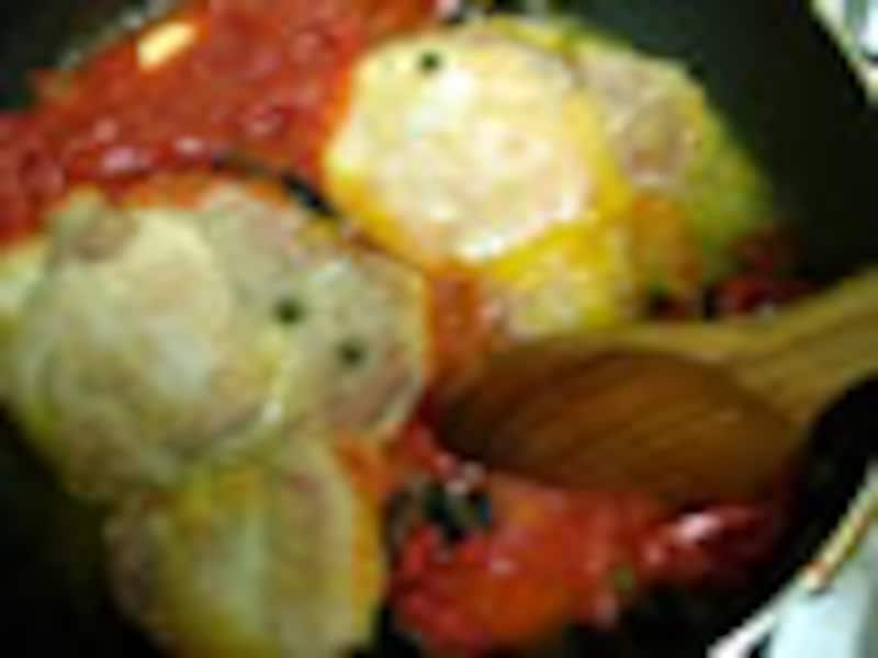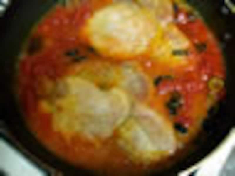 3.2にオリーブ、ケイパー、トマトホールを入れ、塩をふり、トマトホールを木べらで潰して、白ワインを注ぎ入れてフランベし、フタをして、弱火で20分程煮込む。