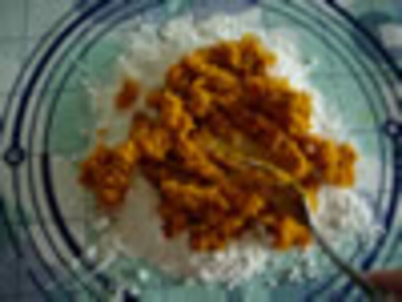 3.作業台に、小麦粉をしき、2のかぼちゃを中心に入れ、そのまん中にくぼみをつけて卵を入れ、フォークで外側から内側にまぜるようにこねる。(手でも可)