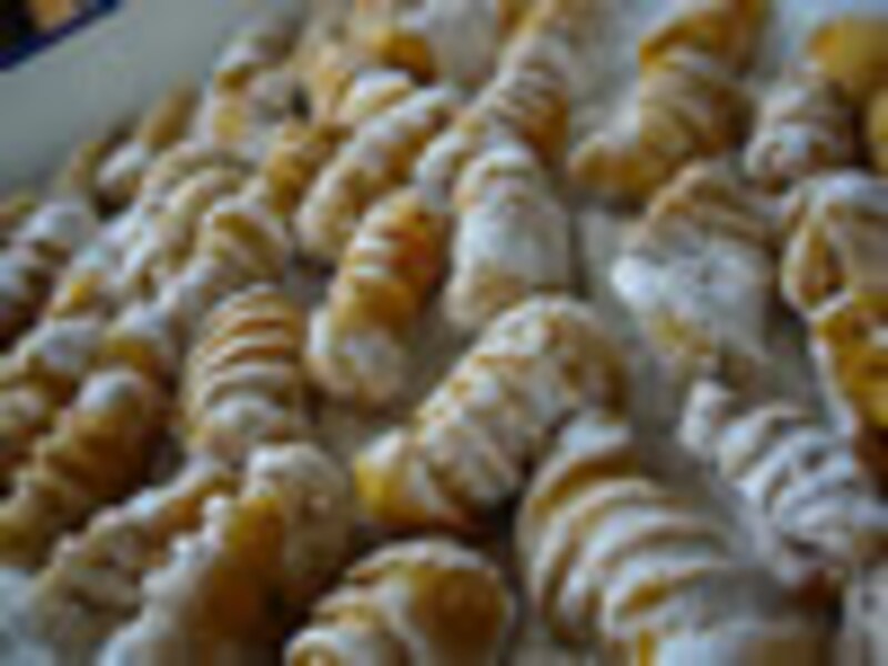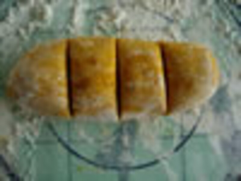 5.打ち粉をして、4の一部を長細く伸ばし、はじから食べやすい大きさに切る。