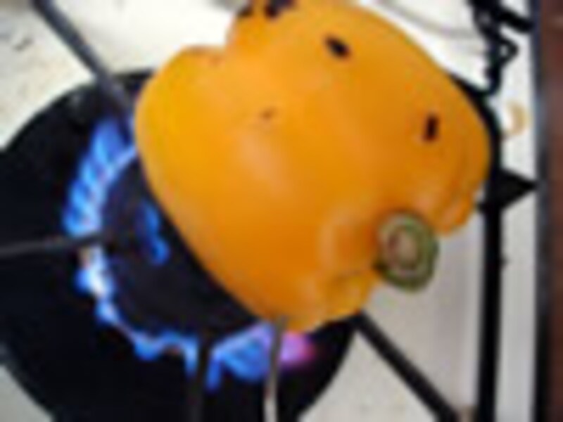 1.パプリカにフォークを刺し、直火にかけ、真っ黒こげにならないように気をつけながら、火にあぶる。