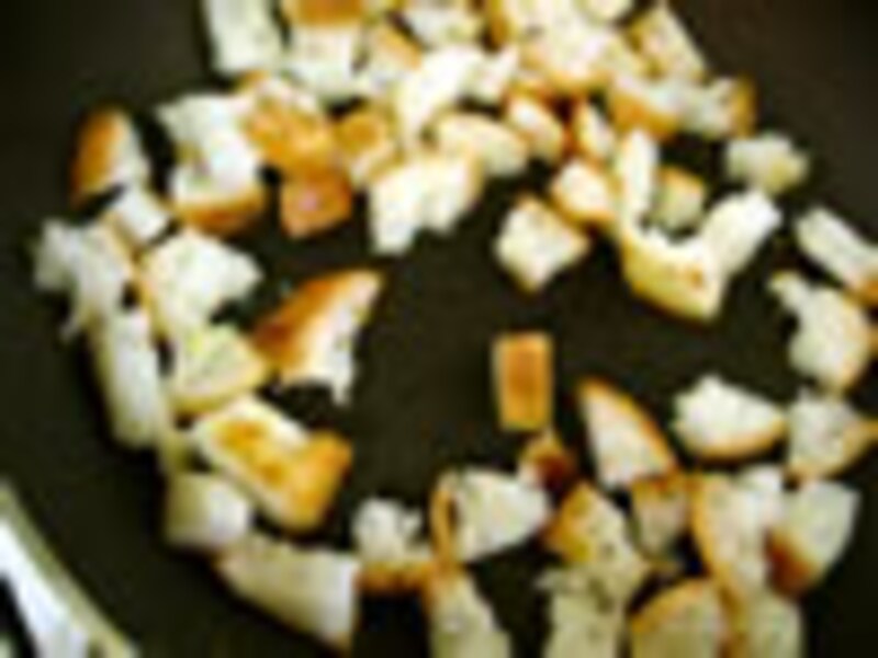 3.ダイスカットしたパンを小さじ1杯程度オリーブオイルをしいたフライパンで中火で5分程炒め、パンの水分を飛ばし、カリカリに焼き上げる。