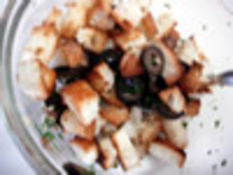 4.ニンニク、アンチョビ、イタリアンパセリの葉はみじん切りにし、ケイパー、スライスしたオリーブ、オリーブオイル大さじ1杯を入れ、よく混ぜ合わせ、3のパンを入れ、パンの形を崩さぬ様に混ぜ合わせる。