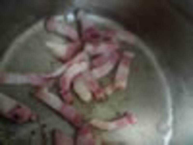 2.鍋に大さじ4杯の水とパンチェッタを入れ、中火にかけ、パンチェッタの脂が水に移りはじめたら、パンチェッタを取り除く。