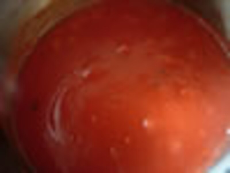 3.鍋に裏ごししたトマトの水煮を加え、塩、コショウ、粉末の唐辛子を入れ、5分程煮込む。
