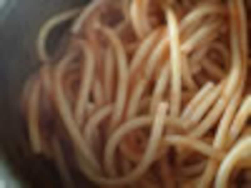 4.塩をしたたっぷり目の湯でブカティーニをアルデンテに茹でる。3のトマトソースに取り除いたパンチェッタを戻し、すりおろしたペコリーノを大さじ2杯加え、ブカティーニを混ぜ合わせて皿に盛る。好みで、イタリアンパセリをふる。