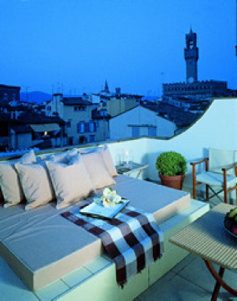中でもおすすめなのが8階建てホテルの最上階にある”ペント・ハウス・スイート”です。テラスにはデイ・ベッドが置かれ、フィレンツェの象徴ドゥオモを背景に朝食を楽しんだり、フィレンツェの夕景からを眺めながらシャンパーングラスを傾ければ、まるでリゾートホテルに居るようなリラックスした時間を満喫できます。