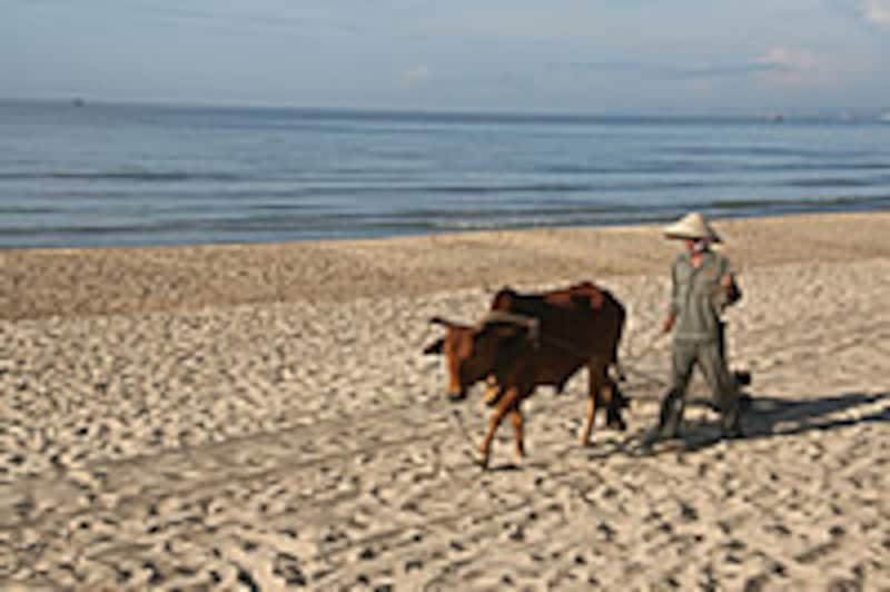 日の出前から浜では、地元民が地引網で、またトゥン(Thung)と呼ばれつ”一寸法師のお椀”のような舟で漁をしています。チョットだけ乗せてもらいましたが、オール1本を器用にあやつり、円盤のような舟を縦横無尽に動くとても機能的な舟でした。