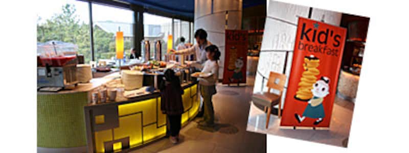 朝食はリゾート地に建つヴィラの広大な庭がイメージの「フォレストガーデン」でブッフェをいただきました。ここでは子供用の食器や椅子はもちろん、低めのカウンターに料理が並び、子供の目線でも好きな料理を選べる「キッズブレックファースト」も用意されています。メニューもハンバーグ、ピラフ、ポテト、オムレツといった子供たちが大好きなメニューがいっぱい。