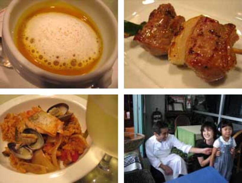 | 左上/体にやさしく染みる「かぼちゃのスープ」、右上/羊の串焼き「ブロシェット」、左下/秋の旨みがギュッと「秋鮭とアサリと舞茸のパエリア」、右下/ラ・サンテの高橋夫妻と、小さな助っ人・余市町の農家さんのお嬢さん |
