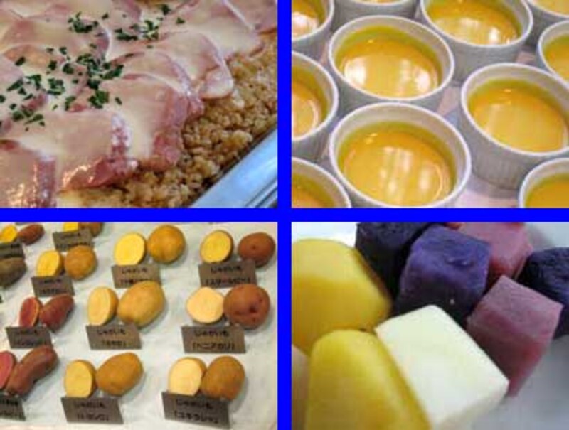 | 左上/発芽玄米ゆきのめぐみとポルチーニのリゾット・日高ホエー放牧豚フィレ肉のコンフィー、道産クリームバターソース 右上/ほっとけ栗たん の冷製クリームスープ 左下/ジャガイモもこんなに品種があるんですよ 右下/カラフルポテト。きれいですよねぇ |