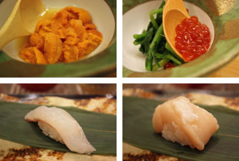 | (左上)解禁になったウニ。殻からむきたて(右上)夏のおしどりは自家菜園の野菜も登場。早摘みの春菊のイクラかけ(左下)締めてから6時間がベターな前浜の肉厚なヒラメ(右下)きりっとエッジのたったむきたてホタテ。臼谷産 |
