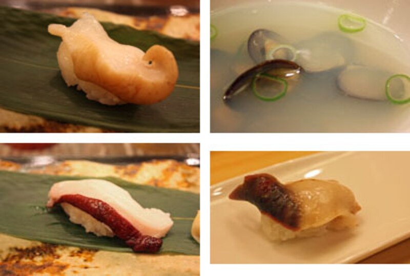 | (左上)このエリアでしか見かけないエゾシロツブ(右上)天塩のシジミは旨い!シジミのエキスたっぷりのお吸いもの(左下)やわらかな食感に驚き。ゆで方にコツがあるのだそう。タコの頭の握りは、足よりも風味強し(右下)「真実のホッキ」と名づけられたホッキの握り。ホッキ貝をむいた時に出る汁を煮詰め、そこで身をしゃぶしゃぶと軽く火を通したもの。生でもボイルでもない。両方の魅力をいいとこ取りしたおいしさ |