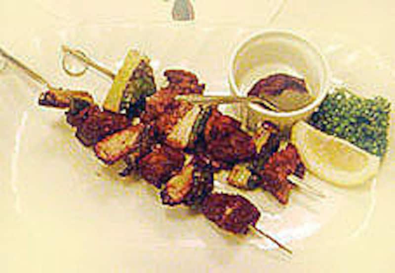 右は「ヤギのカバブ」。野生のヤギ肉をヨーグルトとスパイスでマリネして串焼きしたものです。右上のカップに入ってる「ベリベレ」をつけて召し上がれ。 |