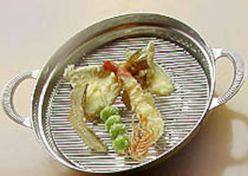 独自にブレンドした太白ごま油と純正ごま油でさくっと揚がった旬の味。上品な天つゆもいいが、沖縄産の<粟國の塩>でいただくとまた格別。 「活海老と野菜のてんぷら定食」(5千円)の内容は、活海老2尾、野菜10品です。 |