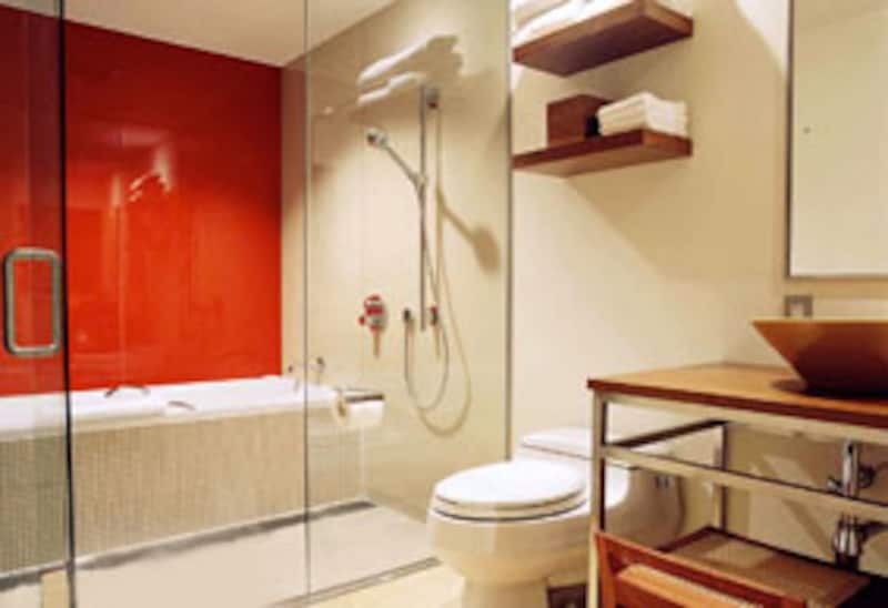 下の2枚は、前ページで触れたお隣401号室。こちらのバスルームは壁のヴィヴィッドな赤で、まったく違う印象を与えてくれる。友人同士で、2部屋借り切って、テラスを通じて行き来するのも楽しいだろう。
