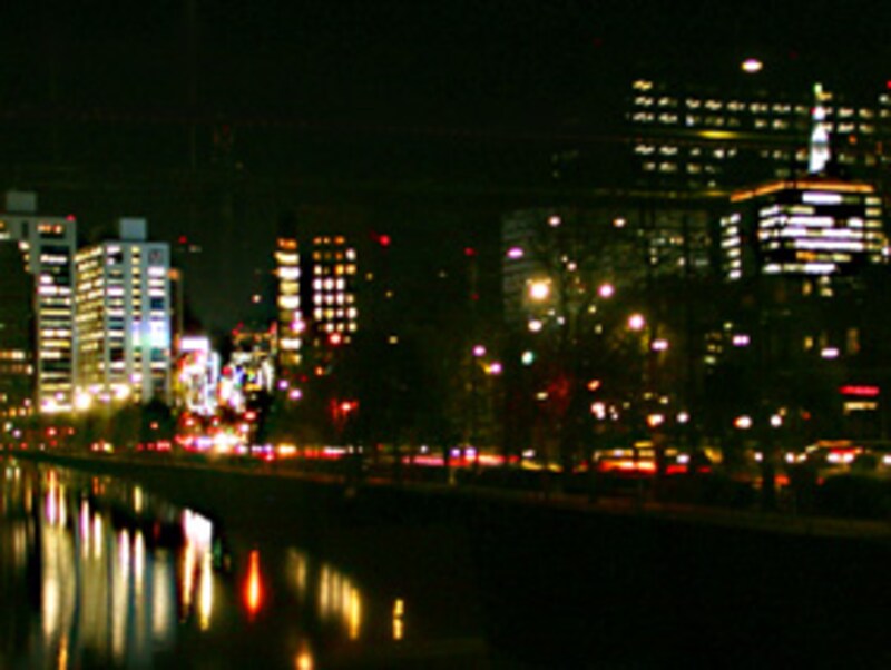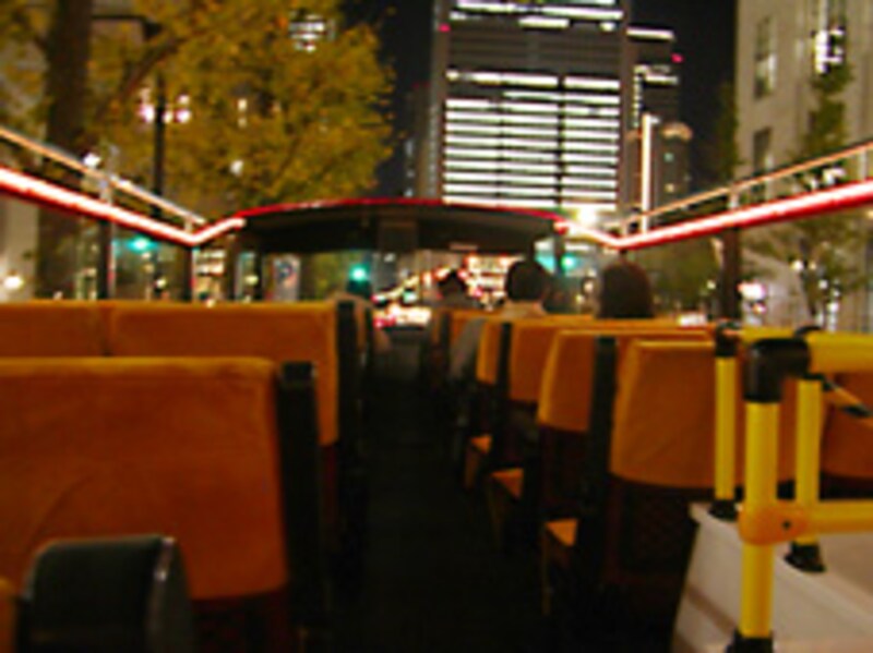 バスは、右手にパレスホテル、ライトアップされた和田倉噴水公園を見ながら左折し、内堀通りへ。さすがに皇居方面は真っ暗でしたが、日比谷公園のそばを通った時、濡れた草の匂いがしました。これもまたオープンバスならでは、ですね。