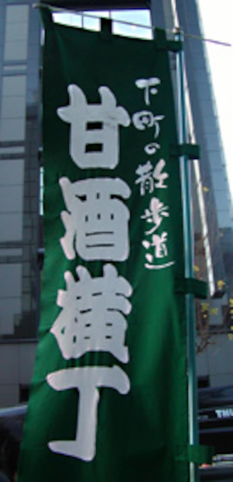 大通りから明治座へ抜ける通りの両側には、「甘酒横丁」という緑ののぼりが並びます。