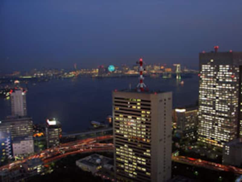 さて、そうこうするうちに東京に夜がやってきました。東側、お台場方面では、観覧車のイルミネーションが忙しそうに動いています。