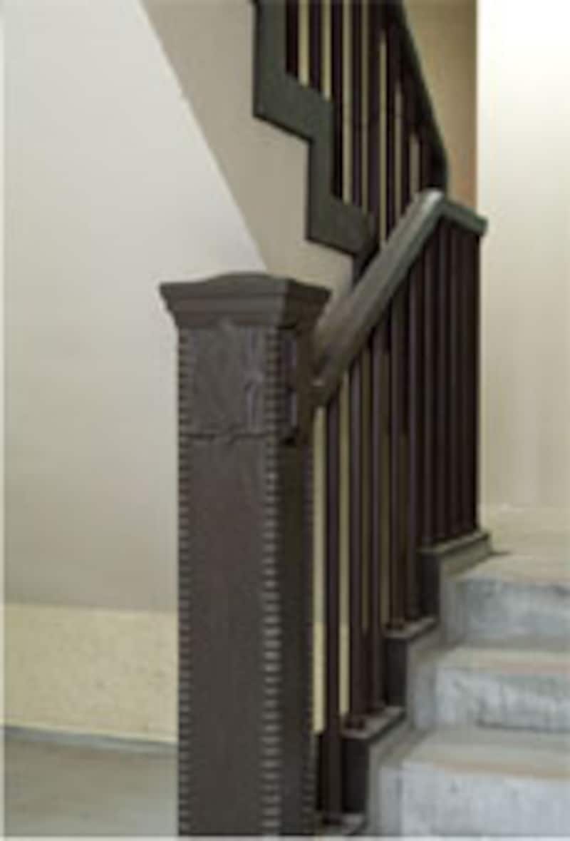 手すり、外講石、避難用フック、ドア止めなどに、かつてのパーツが再利用されている。さて、いくつ発見できるだろうか。
