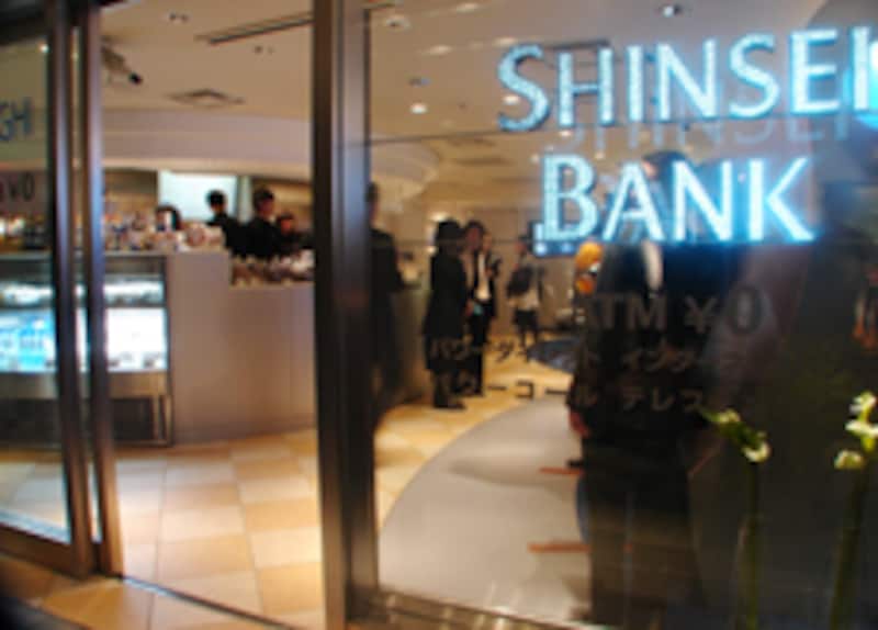 ・右の写真は正真正銘「新生銀行」だが、ちょっと最初は銀行だと気づかない。デロンギのショールーム機能がついたカフェが併設されているのだ。近未来の銀行スタイルを