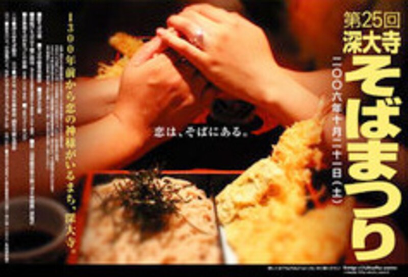本堂前でそば職人が献上そばを披露した後、そば守観音様に奉納します。深大寺が縁結びに霊験あらたかな事から「縁結びそば」イベントも。そば以外にも、調布のうまいもんの露店をお楽しみください。