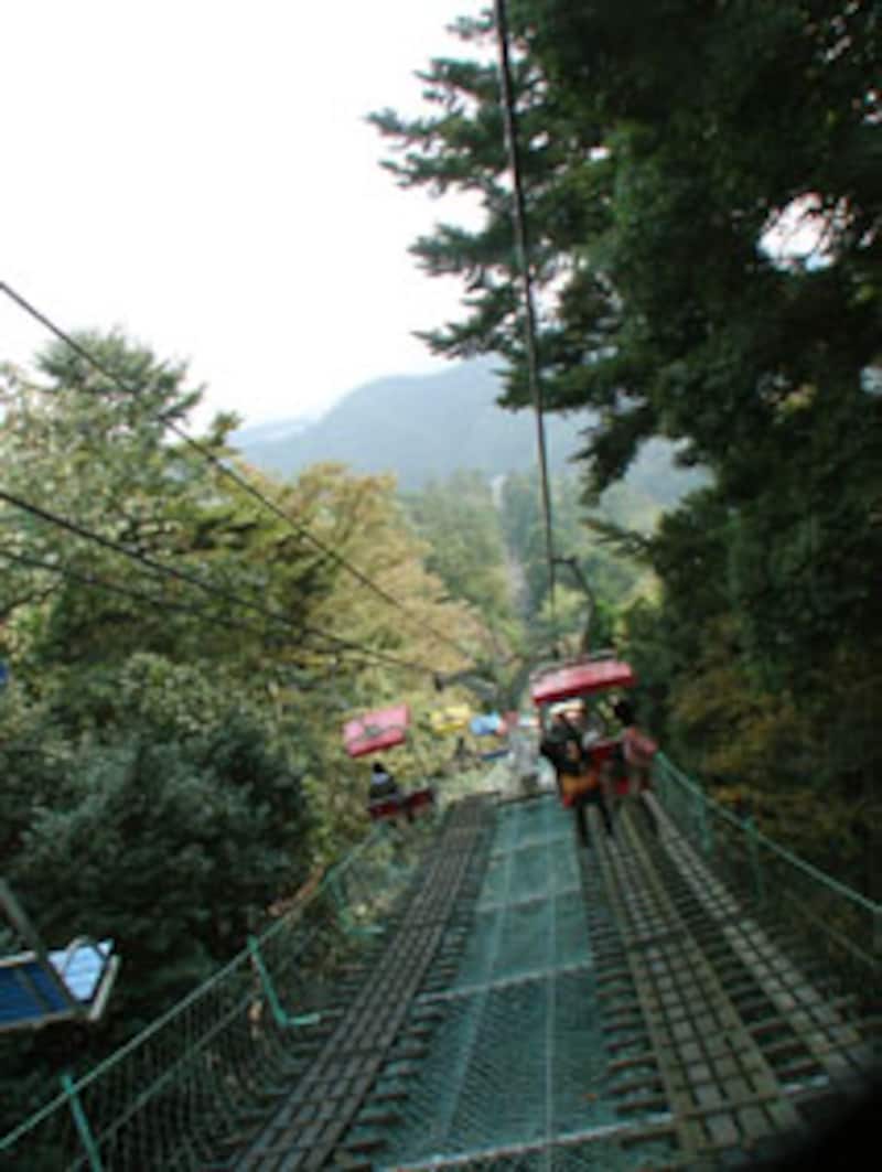 上りのリフトから後ろを振り返れば・・・。足元に網が張ってあるとはいえ、ベルトも無しに10分近く揺られているのは、なかなかにスリリングだ。特に下りは迫力2倍増し。 |