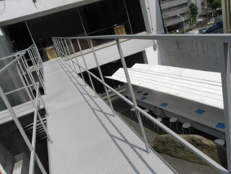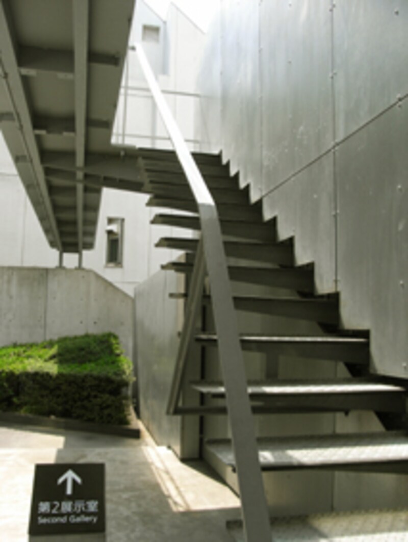 | 階段を昇る。中庭の上にわたされた廊下の正面が第2展示室。右下に、中庭に置かれた屋台の屋根が見えている。 |