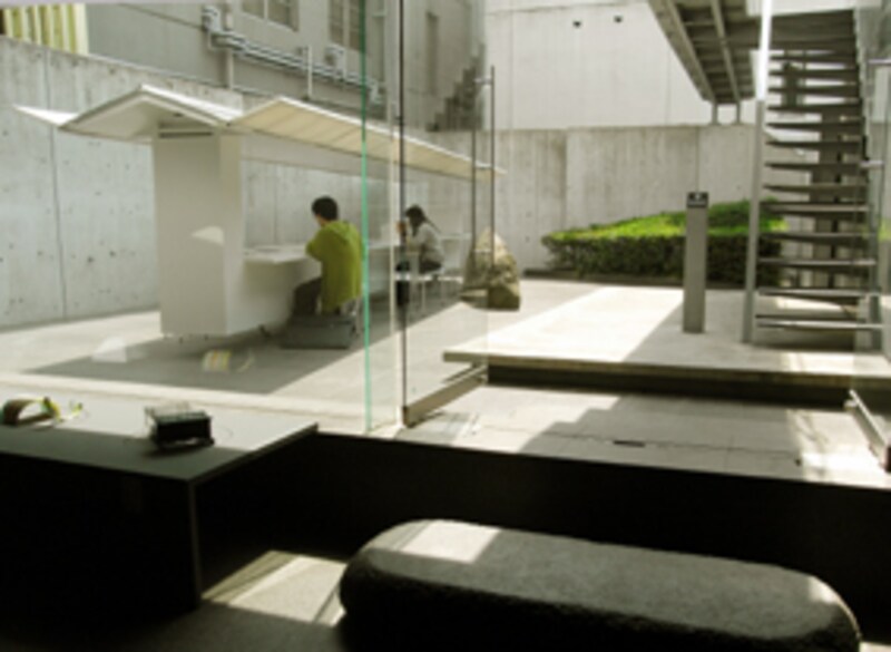 この、ビルとビルの谷間に生まれた、庭石のある中庭をどう使うのか。壁の色はどうするのか。展覧会によって、雰囲気もガラリと変わるそうです。