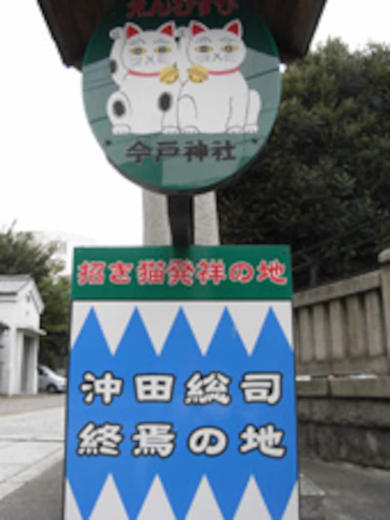 | 招き猫発祥の地の案内板。新撰組、沖田総司がここで亡くなったという説もある |