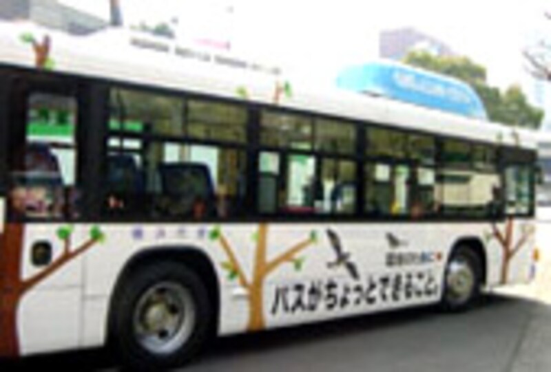 燃料タンクの部分は、どのデザインも空と雲が描かれています。さらに、上から見ると、横浜市バス・地下鉄のイメージキャラクターである「はまりん」が雲になって浮かんでいます。ビルの窓などから眺める機会があれば、バスの屋根を見てみてくださいね。これらのバスは、新横浜駅を中心に、港北区・鶴見区などを運行する路線に、順次登場します。お披露目の時に、通りかかった年輩の方が「子どもが喜びそうね」と言っていました。ホント、子どもたちにも親しみのわくイラストになっています。