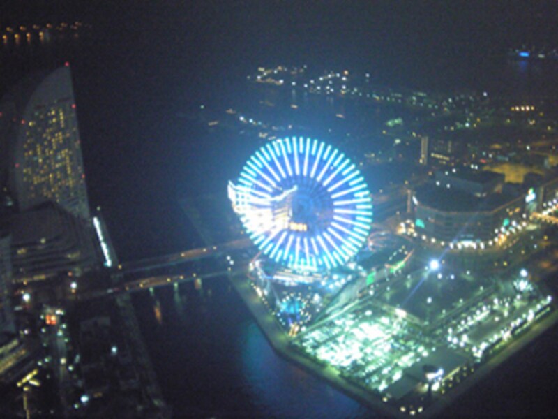 薄暮の19:00。大観覧車コスモクロック21が輝きはじめる時間です。いつもは見上げているコスモクロック21ですが、今日ばかりはおもちゃのよう。くるくるとイルミネーションが輝きます。家路へと急ぐクルマのテールランプ、ホテルにぽつぽつと灯る明かり、少しずつ少しずつ、日が暮れてゆきます。私が一番おすすめの時間帯です。![]() |
