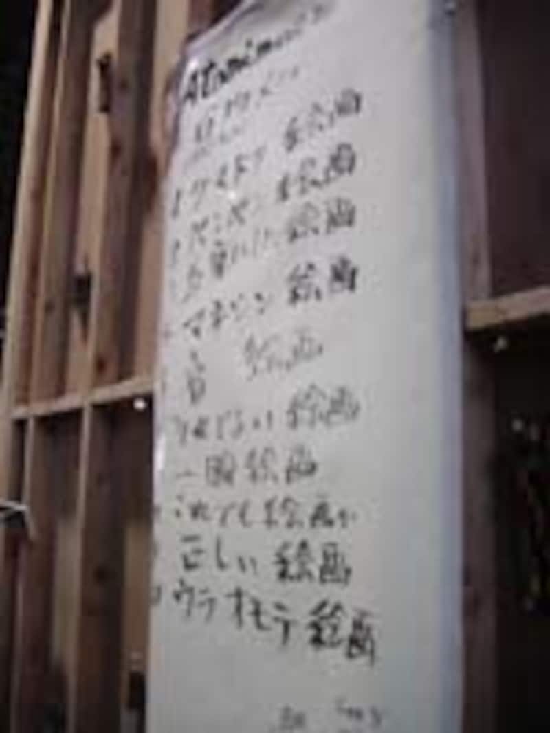 ぜひお試しいただきたいのが『百均絵画』(堀尾貞治+現場芸術集団「空気」)。壁に張ってあるシートの穴に100円を入れ、10のメニューの中から好きなものを穴に向かって告げます。すると、壁の背後で待機している堀尾氏をはじめとするアーティストたちが、即興で作品を描くのです。あやしげな音がしたかと思うと、シートの下の隙間から作品が出てきます。まるで芸術の自動販売機。来場記念にいかがでしょうか。