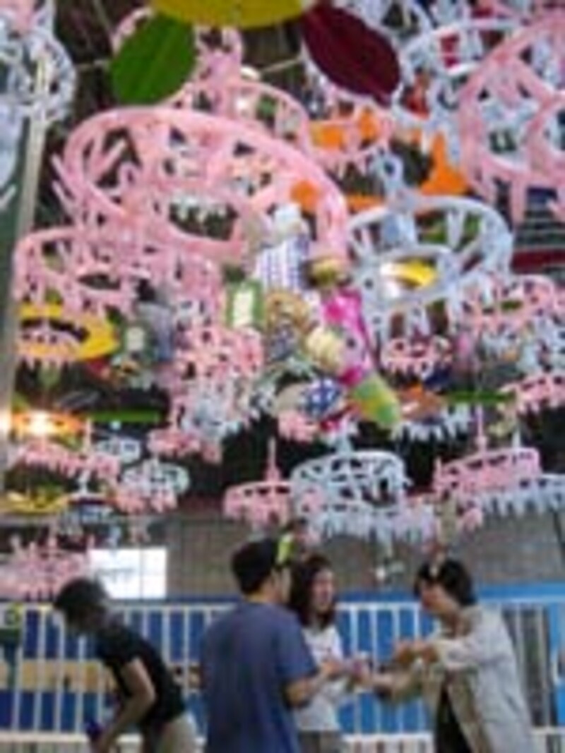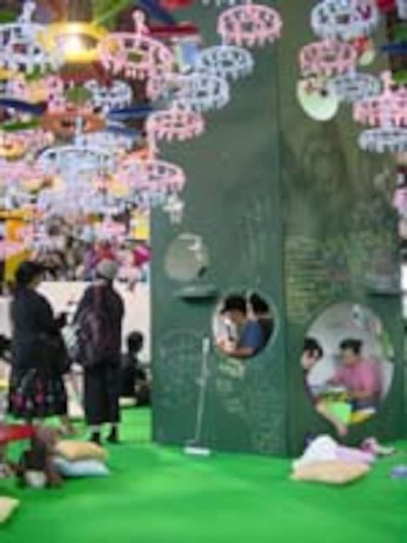 私がひとめぼれしたのが『毎日森』(安部泰輔)のぬいぐるみ。安部氏とスタッフが、ミシンで古着を利用した布を懸命に縫い合わせ、カラフルなぬいぐるみを制作している姿を見ることができます。できあがったぬいぐるみは、写真のように洗濯ばさみで吊るされ、まるで森のよう。安部氏によると、「靴をぬいでカーペットにあがり、シートに寝っころがって見てください」とのこと。赤ちゃんのメロディメリーのように、ぬいぐるみがくるくると回って、なんとも心地よい雰囲気に包まれます。