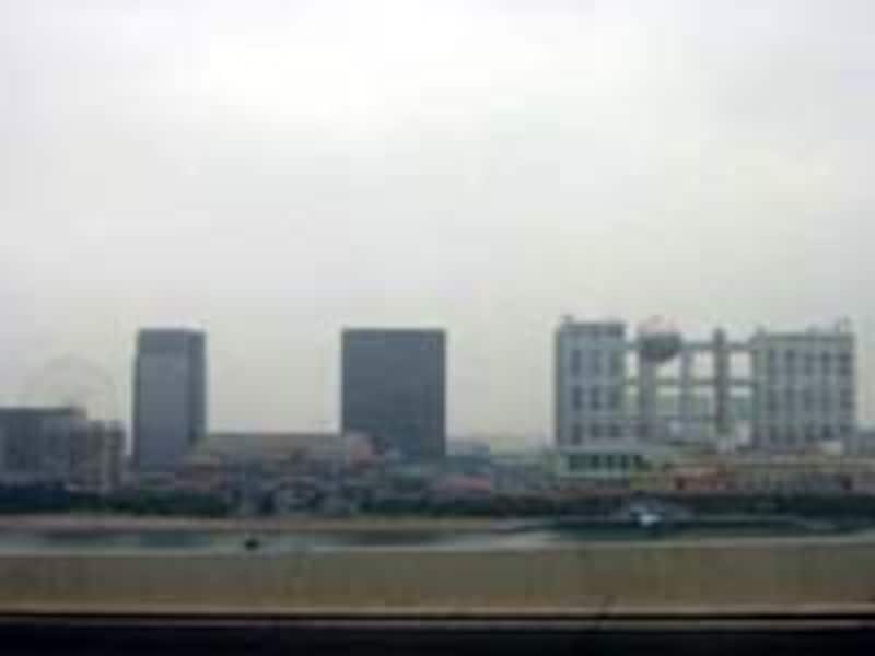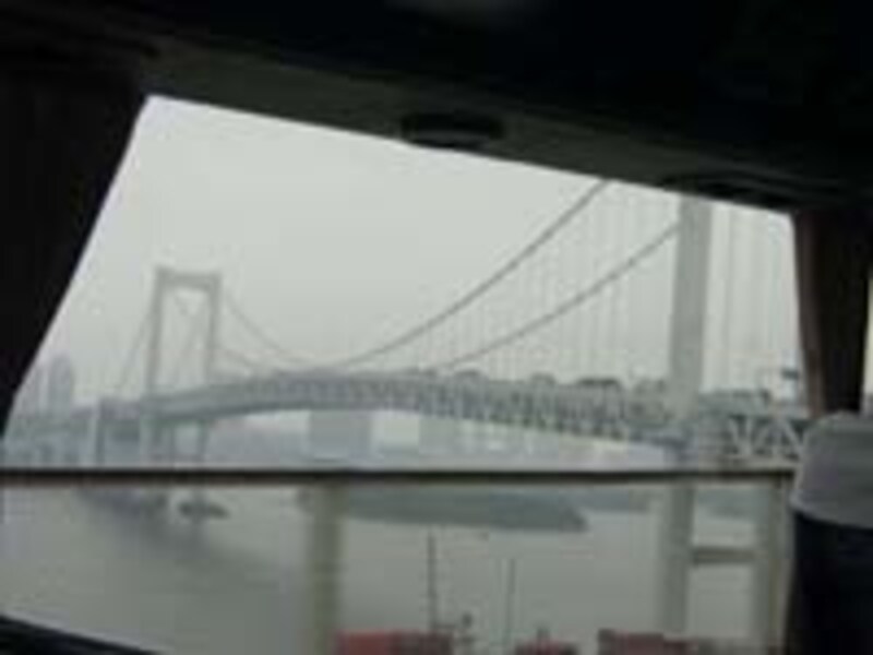 | 通過していく景色の説明を聞きながら、バスは横浜をめざします。左:レインボーブリッジ 右:お台場 | |