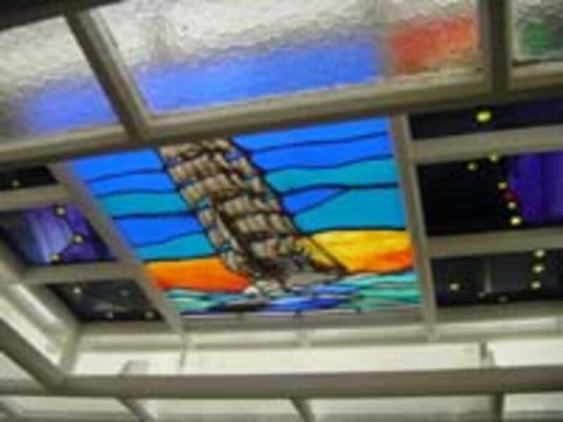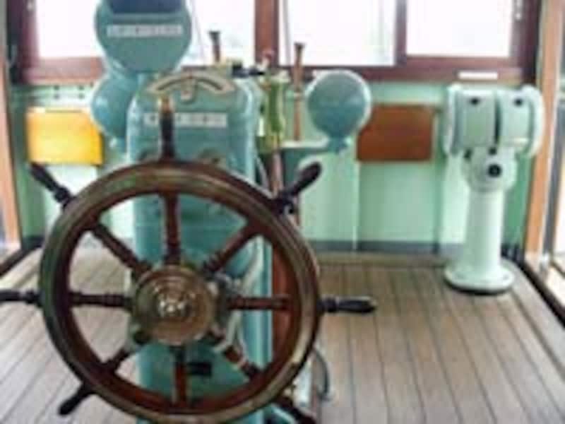| 左:舵やエンジン、計器類などを実際にみることができます 右:仕官室の天井には美しいステンドグラスが! |