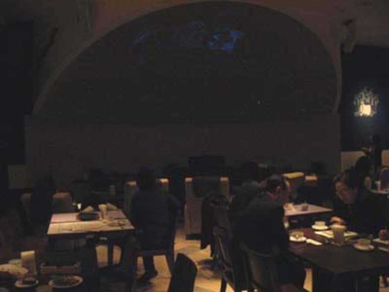 通常は、ムーミンのキャラクターたちやマリメッコのソファがかわいいレストラン。「まもなくプラネタリウムショーがはじまります」というナレーションが入ると店内の明かりが落とされ、かなり暗くなります。まもなく、ドーム型スクリーンに幻想的な星空が映し出され、ナレーターが星について解説します。皆さん、食事の手をとめて、しばし星空に見入っていました。