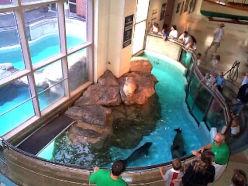 ここの水族館はあちこちにスタッフが常駐(しかもボランティアだったりする)していて、子供たちに海の生物について説明をしてくれるという特徴がある。まさしく子供たちのための水族館なのだ。まず入場チケットを買って入口へ向かうと、水槽がすぐに見える。この日は、よっぽど暑かったのか中央の岩の上に、白いデブなアザラシが昼寝してて、ビクとも動かなかった。小ぶりな斑点のあるアザラシは気持ちよさげにプールをスイスイ泳いでいた。サメやサケに、怖い顔した魚もいる。横で「サーモンだわ」と白人ママに英語で指差されると、スモークサーモンになった姿を想像してしまう。他の水族館にいるようなカラフルな魚のタンクは一つくらいしかない。あとは地味な色の魚が泳いでて、あれ?これって、どこかで見たような・・・。フグやタイやヒラメが泳いでるところが見れるし。そ~だ、活き魚料理屋の生簀なのだ。なんだかタイやヒラメって浦島太郎な気分。とはいえ、なによりも美しかったのは、クラゲの水槽。大きな円筒のタンクにクラゲがウジャウジャいるんだけど、優雅に泳いでて広がったり縮んだり不思議な光を発する。カワウソは可愛いので、見ていて心がなごんだ。水族館といえども、イルカやシャチが飛んだり跳ねたりするわけじゃない。