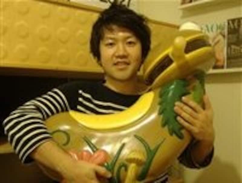 | アンティークのマクドナルド初期キャラクターを抱えた榎本さん。まだ20代! |