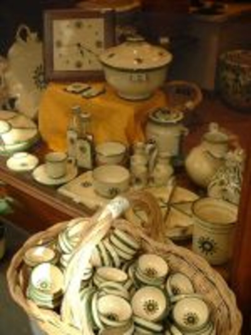 トスカーナ南部で多く見られるヒマワリと、緑と黄色の配色がいかにもな食器はトスカーナ土産にピッタリ。にんにく保存用の壷や、