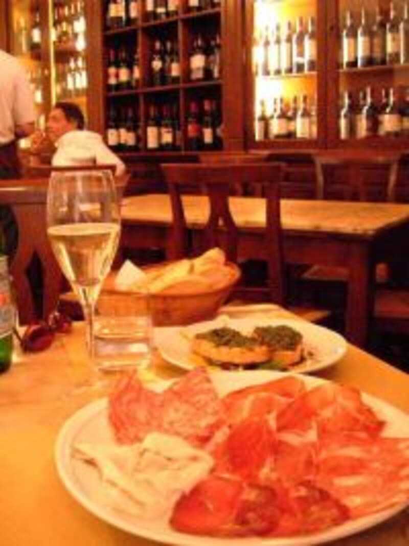 観光客でにぎわうカンポ広場から歩いてスグ。の割には落ち着いて、かつ、お食事もできる優秀なエノテカ。 ワインがグラスで3.5ユーロから。 トスカーナ産のサラミやプロシュートの盛り合わせ(メニューで見つけられなかったらIL MISTO DI AFFETTATO TOSCANOといえば 適当に盛り合わせにしてくれます)をオーダーし、まずは地元の味を堪能。 日替わりで、サラダ風パスタやオリジナルのドラゴンチェッロ(シエナ近郊でよく使われるハーブ)の ペーストあえしたニョッキなど、一工夫あるパスタがあります。 グラスワイン2杯、アンティパスト、プリモ、デザート、カフェで一人30ユーロ弱(ワインによる)。 トスカーナやイタリア全土の珍しいワインに囲まれて、満足のひとときを過ごせるはずです。 特にランチは、地元客の中には一人でワインとパスタの食事をしていく人もいるので、 一人旅の時も入りやすそう。